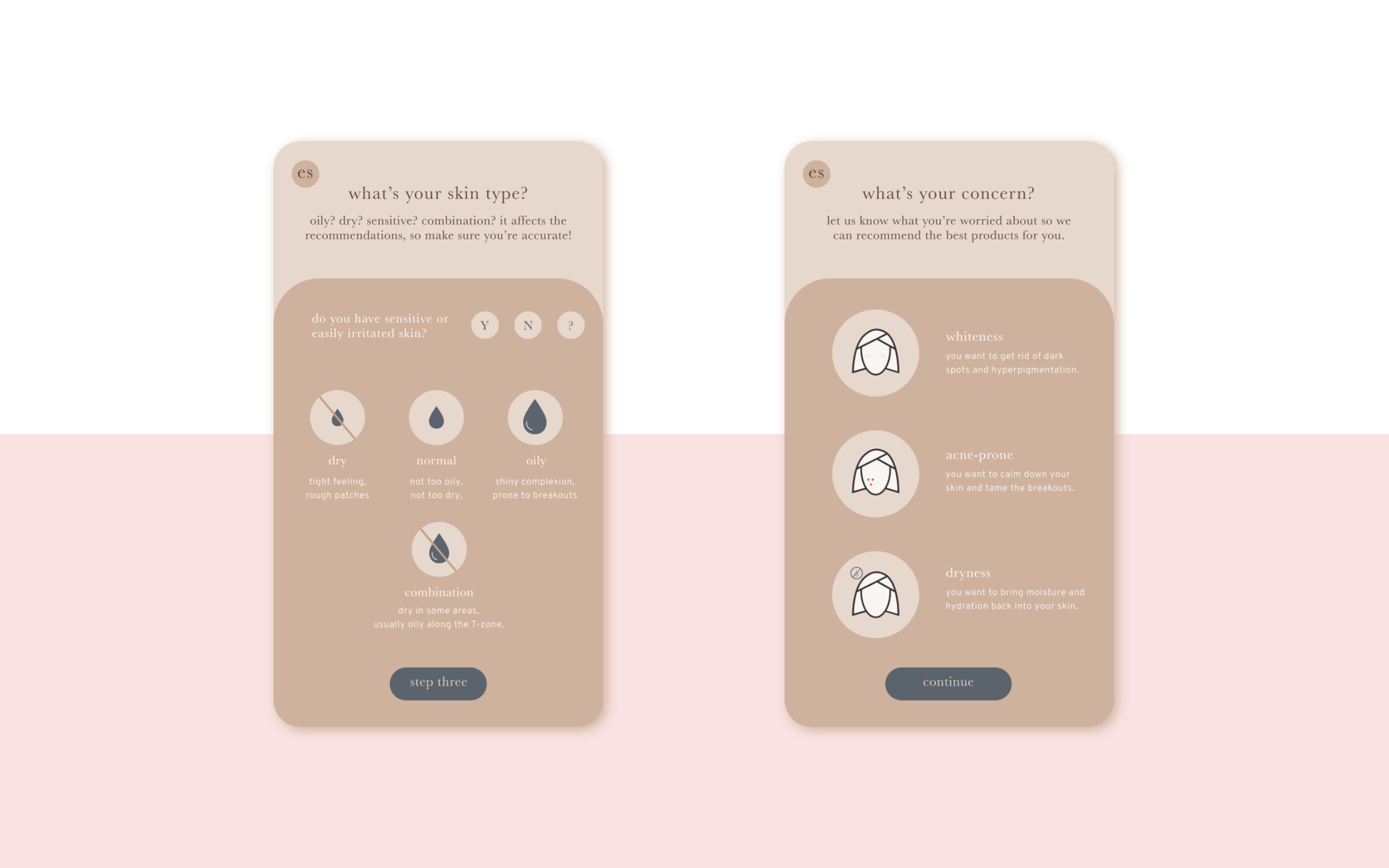 Ease Skin is an idea that a friend and I came up with when we were hiking (not really, just walking) a trail over the summer. He wanted to make a responsive web app that gave people ingredient recommendations based on an image of their skin, and he wanted me to be the product designer for it.